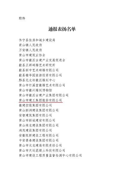 市委、市政府于2024年10月24日至25日成功舉辦中國(黃山)第四屆徽派古建產(chǎn)業(yè)發(fā)展大會。近日,中國(黃山)徽派古建產(chǎn)業(yè)發(fā)展大會籌備工作領(lǐng)導(dǎo)小組辦公室發(fā)布《關(guān)于對中國(黃山)第四屆徽派古建產(chǎn)業(yè)發(fā)展大會中做出突出貢獻(xiàn)的單位給予表揚(yáng)的通報》,黃山建工集團(tuán)榮列其中。